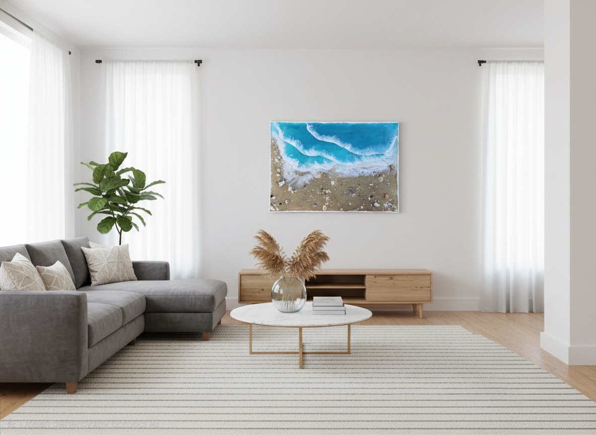 Vydejte se na cestu klidu a harmonie s naším originálním obrazem inspirovaným mořem. Tento jedinečný kousek, vyrobený z vysoce kvalitní epoxidové pryskyřice, zachycuje nejen kouzlo krásných mořských vln, ale i atmosféru písečných pláží. Obsahuje drobné mušle, zářivé hvězdice a různobarevné kamínky, které do kompozice vnášejí prvek přírodní rozmanitosti. Tato kombinace materiálů a textur vytváří útulnou atmosféru, jemně vybízející k zasnění nad krásami oceánského světa. Obraz je ideálním kouskem pro milovníky moře a přírodních krás, přinášející do vašeho interiéru pocit klidu a harmonie.